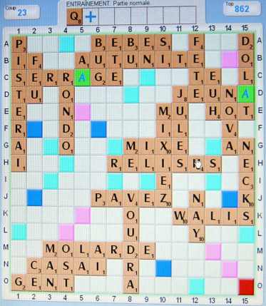 - DNO-NOYQ : lettres chères : Q pas de U, peu de chance, le W sur le jeu permet un won (11K) 12 peu payant, le Y : ay, nay, plusieurs places, pour